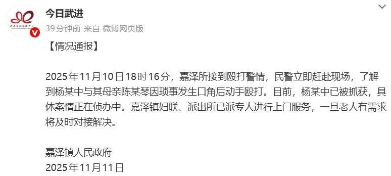 2025年11月10日18时16分,嘉泽所接到殴打警情,民警立即赶赴现场,了解到杨某中与其母亲陈某琴因琐事发生口角后动手殴打。