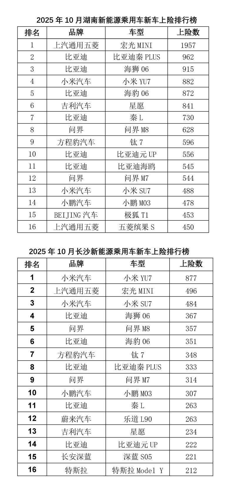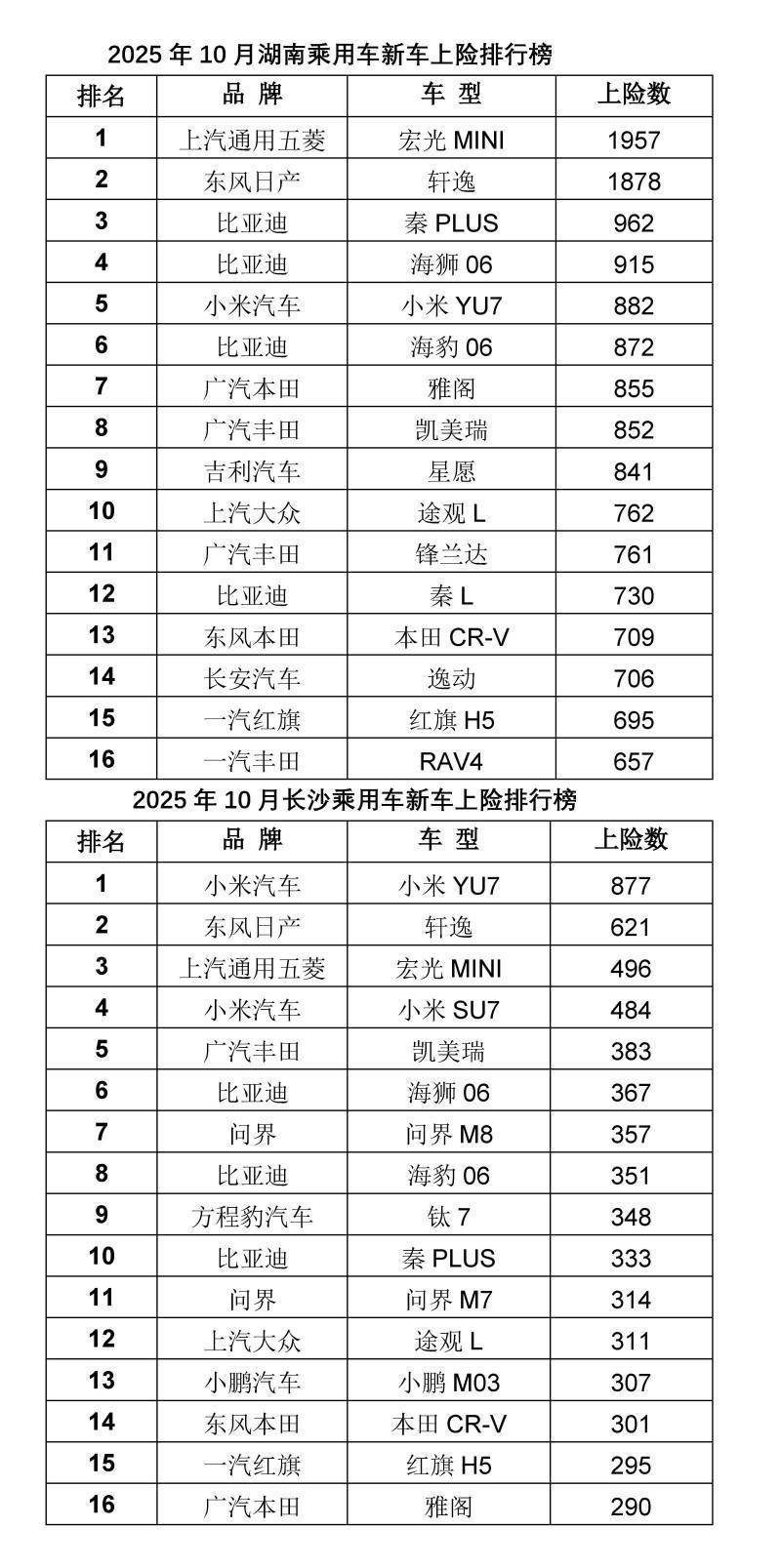 比亚迪则再度在榜单上显示出了厚度,总计有4款车型进入10月湖南新车上险量(包括油车和电车)的TOP16,而方程豹品牌的钛7则在10月长沙新车上险量榜单中排名第9。长期以来,比亚迪主要靠小米汽车的表现有些再度让人意外,在10月长沙新车上险数榜单上,小米YU7和小米SU7竟然分居第一和第四。目前,小米仅有两款车型在销,且近期其品牌形象因为多重因素受到了打击,但这两款车型能有如此的表现,无疑印证了小米汽车的号召力和受青睐度。